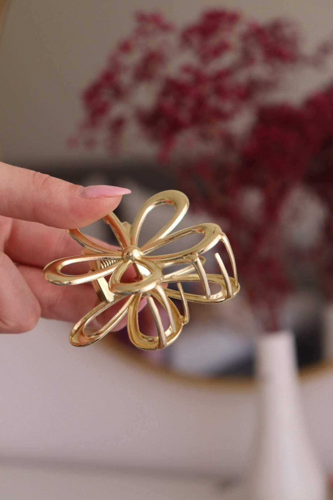 Die blumenförmige Haarklammer in edlem Gold Finish verleiht jeder Frisur einen femininen, modernen Touch. Ob für festliche Anlässe oder den Alltag, diese Accessoire ist ein echter Hingucker. Ideal für Hochsteckfrisuren oder als dekoratives Element in offenen Haaren.