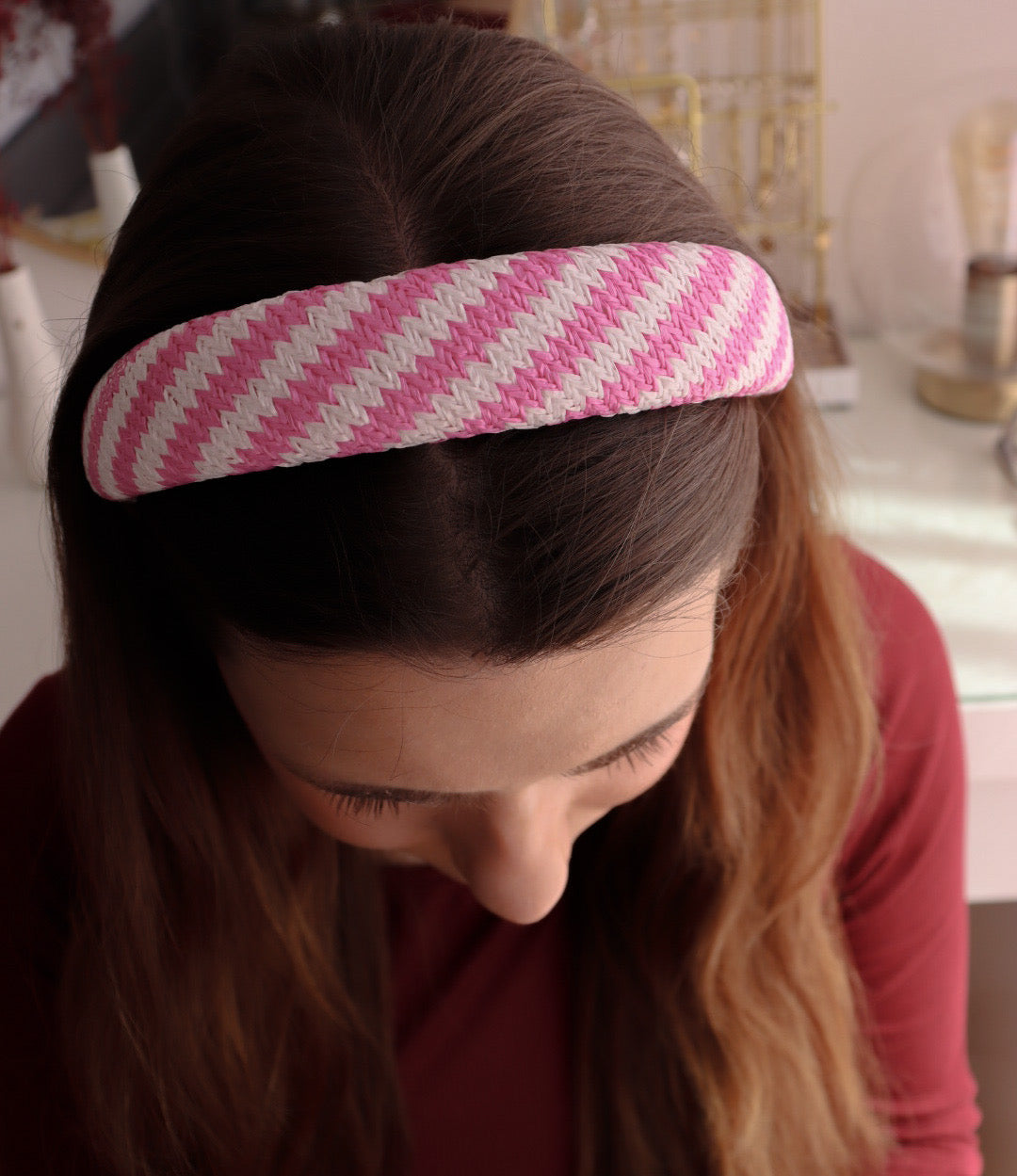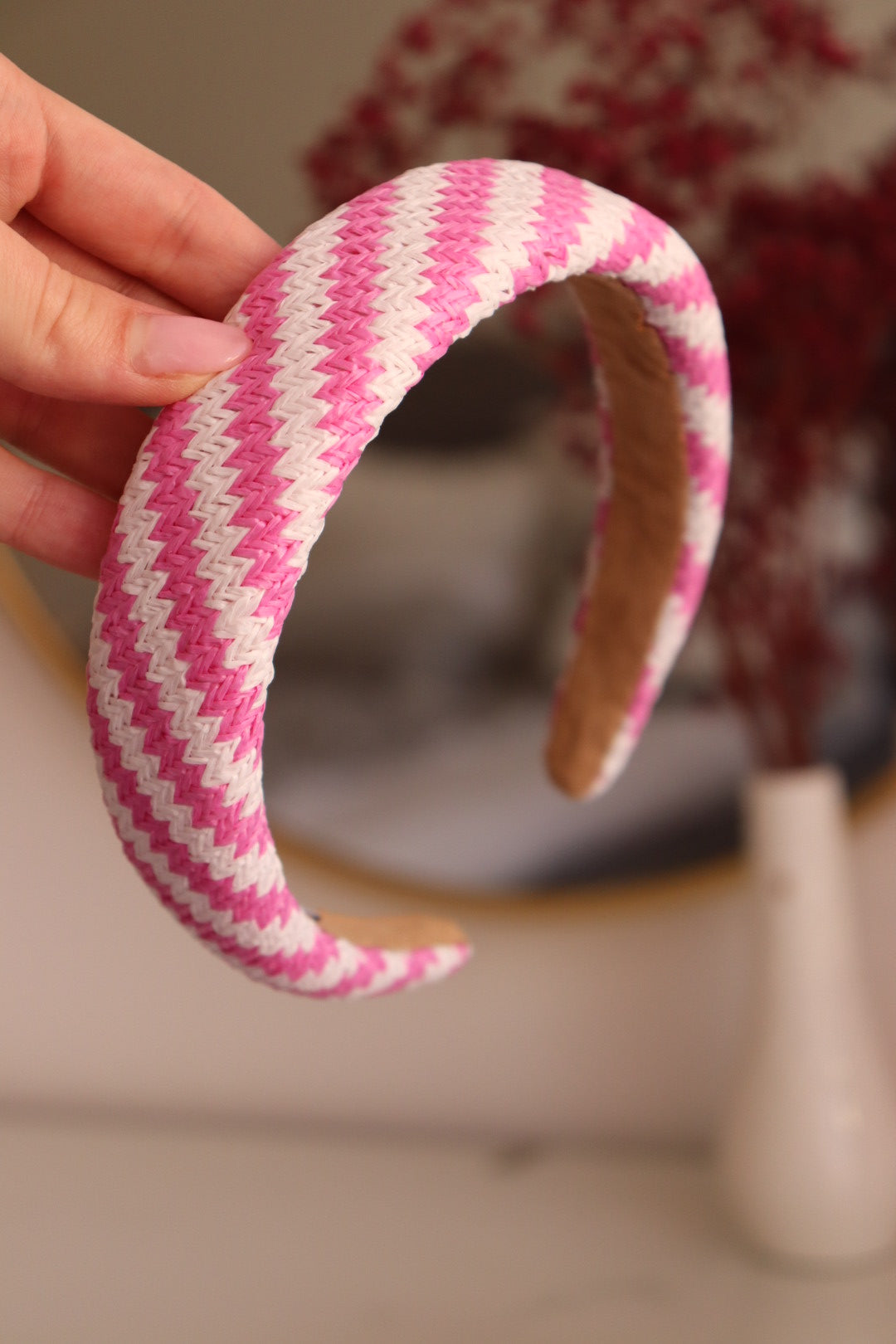 Dieser bereite Haarreif kombiniert rosa-weiß gestreiften Stoff mit einer modernen, strukturierten Oberfläche, die deinem Look Frischen und Eleganz verleiht. Das raffinierte Zickzack-Muster sorgt für einen lebendigen Akzent, während das gepolsterte Innenfutter angenehmen Tragekomfort bietet - den ganzen Tag!