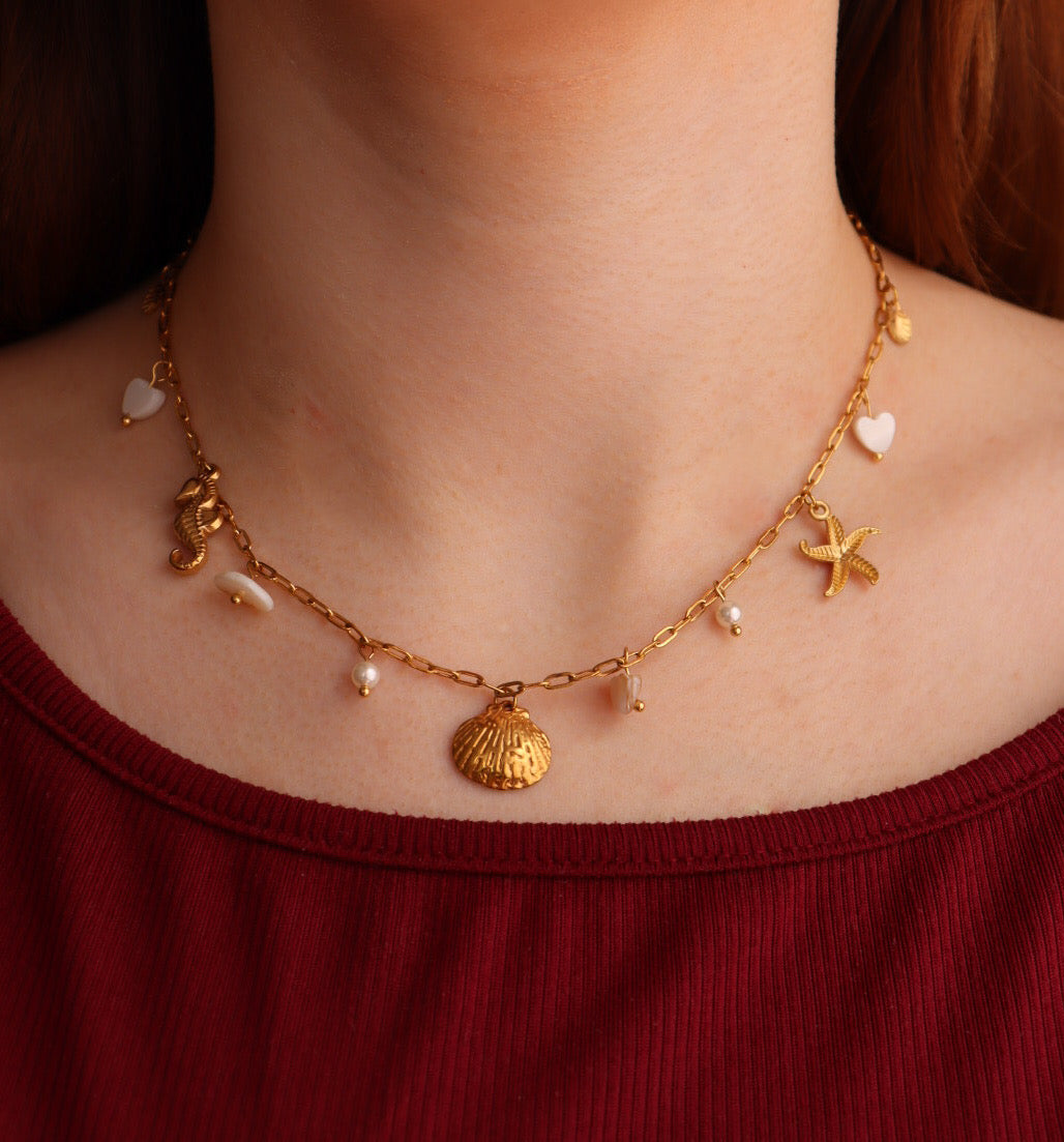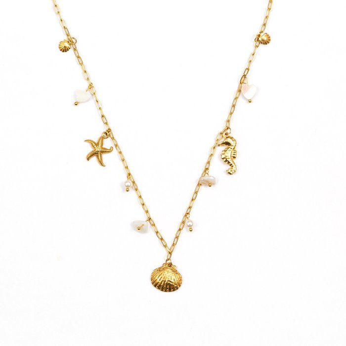 Setze einen stillvollen Akzent mit der Halskette „Salt Breeze“, diese ist gefertigt aus hochwertigem, farbbeständigem Edelstahl und veredelt mit liebevollen Details im maritimen Design. Durch kleine Anhänger, wie Muschel, Seestern und weitere Perlenelemente erhält sie einen femininen und sommerlichen Look.