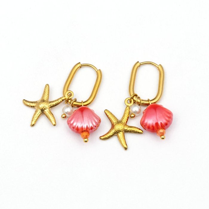Stilvolle Ohrringe – goldene Seesterne & rosafarbene Muschelanhänger aus wasserfestem Premium-Edelstahl. Perfekt für deinen Sommerlook!